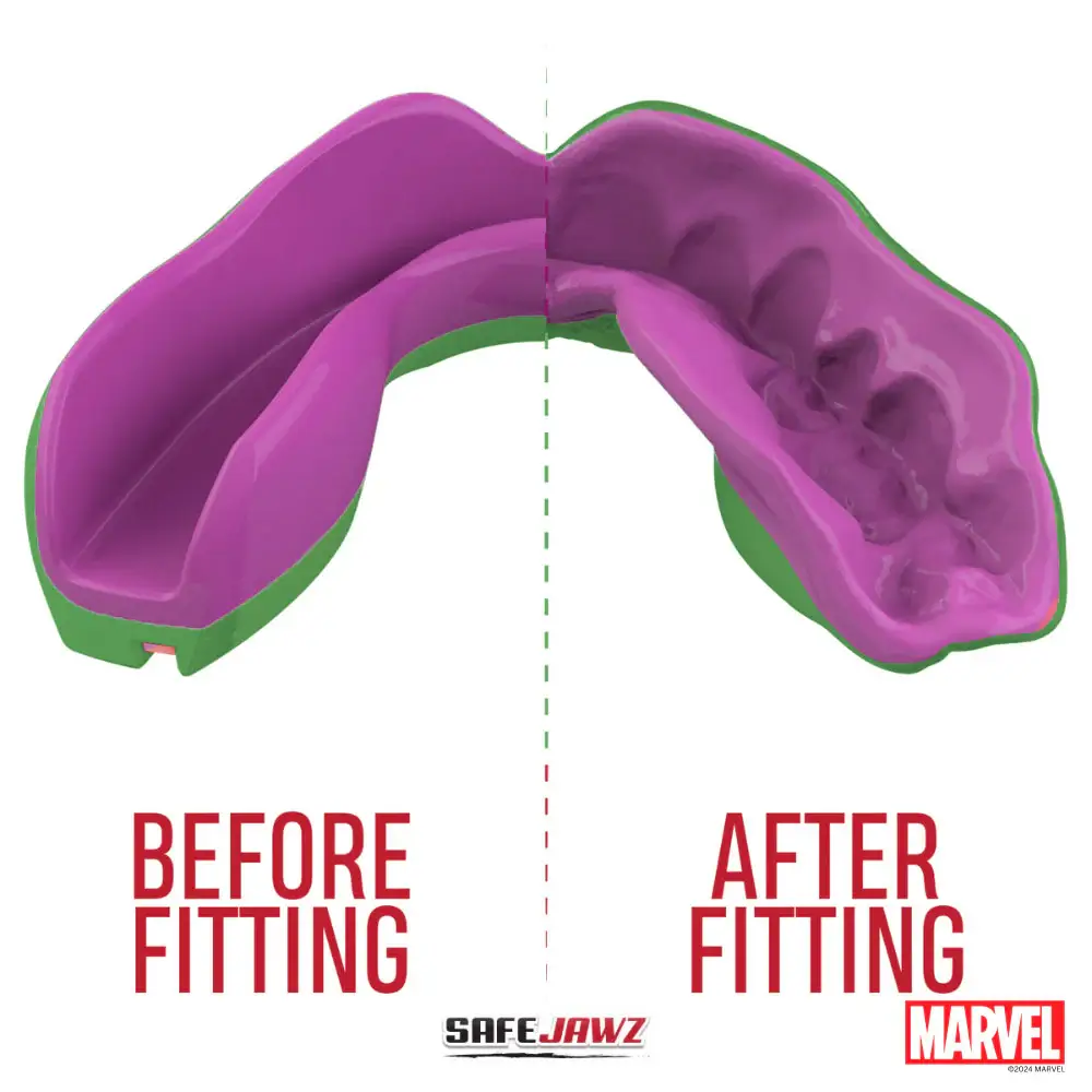 The SAFEJAWZ Marvel Series mouthguards have Fluid Fit™ Technology which means that these SAFEJAWZ® guards feature a super-slim profile and great retentive qualities. The guard will essentially clip onto the teeth and fit comfortably so that breathing, talking and drinking will not be a problem.