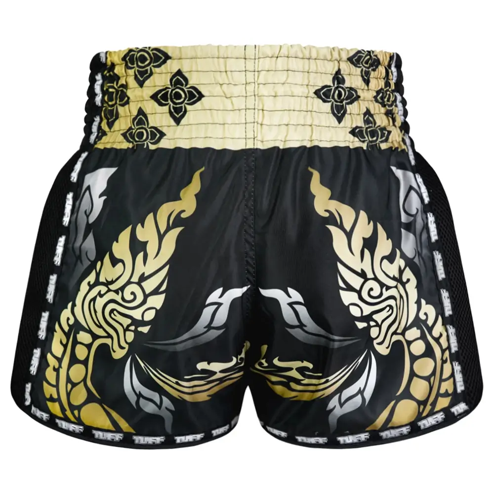 The black boxing shorts feature a golden Thai traditional pattern which is influenced by the graceful Hongsa and the guardian of the treasure, Naga.